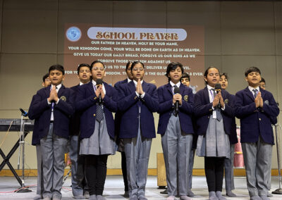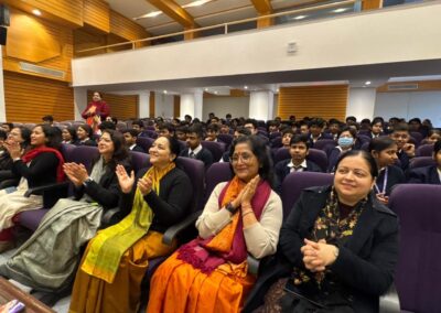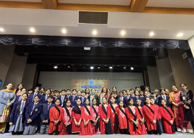 This was followed by the Lighting of the Ceremonial Lamp by the Chief Guests—Mr. Lakshay Pandey, Deputy Superintendent of Police and an alumnus of the school, and Mr. Bhumitra Sharma, an accomplished software developer and debater. The school choir performed a soulful Saraswati Vandana, adding a spiritual touch to the occasion. Mr. Lakshay Pandey, from the Class of 2011, is a Civil Services qualifier who has served in the Andaman and Nicobar Islands and currently serves in Chandigarh. Mr. Bhumitra Sharma, with his dual expertise in technology and public speaking, has inspired many as an adjudicator and mentor.